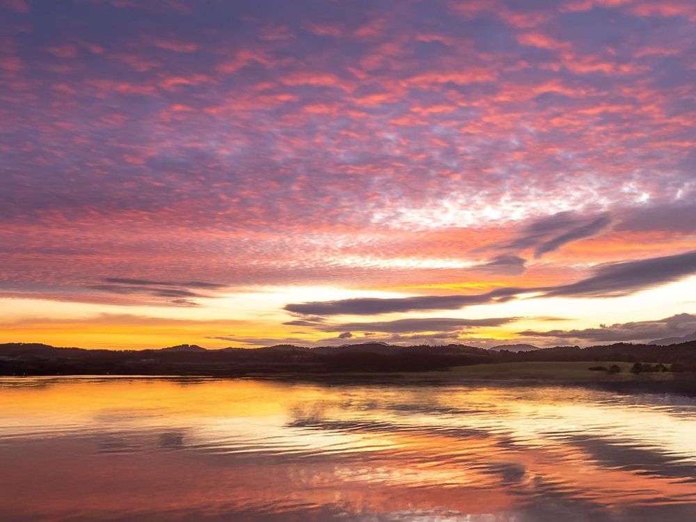 Ein farbenprächtiges Bild mit den betörenden Farben eines wunderschönen Morgens am See. Der feurige Himmel spiegelt sich im Wasser und scheint mit dem Wasser zu verschmelzen. Das erste Licht leuchtet am Horizont. Was für eine schöne Stimmung den neuen Tag erwachen lässt.