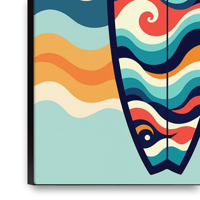 Ein Surfbrett tanzt im Farbenmeer, Wellen umspielen seine elegante Silhouette. Intensive Töne und lebendige Muster feiern die Freude des Surfens, die Freiheit des Wassers, Sonne, Kunst und die Magie der Surfgemeinschaft.