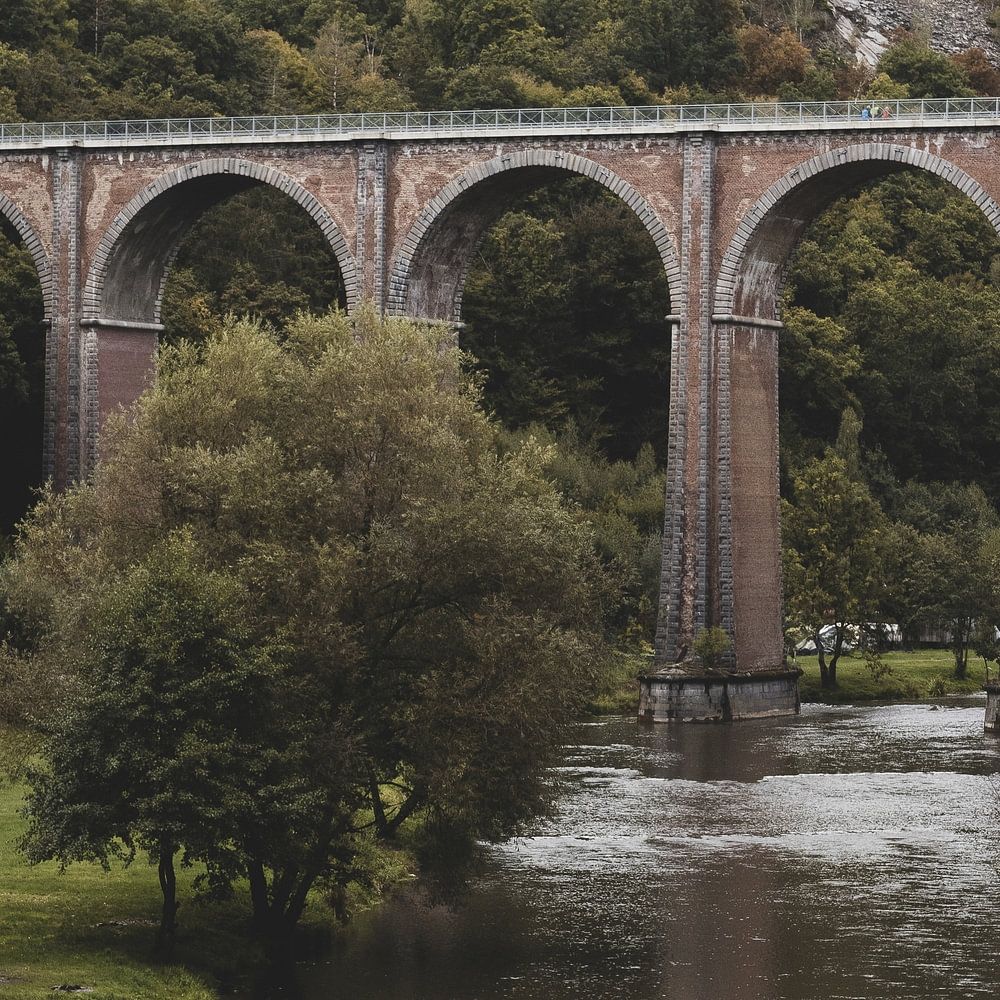 Das Conques-Viadukt (Viaduct du Conques) erhebt sich stolz vor dem dramatischen, stimmungsvollen Himmel und bildet einen fesselnden Kontrast zwischen dem vom Menschen geschaffenen Bauwerk und der natürlichen Schönheit der belgischen Ardennen. Die Bogenbrücke spannt sich anmutig über den Fluss Semois, umgeben von üppigem Frühherbstlaub und dem ruhigen Wasser unter ihr. Die Szene erweckt ein Gefühl friedlicher Gelassenheit, wobei das Viadukt als Zeugnis menschlicher Ingenieurskunst inmitten der malerischen belgischen Landschaft dient.