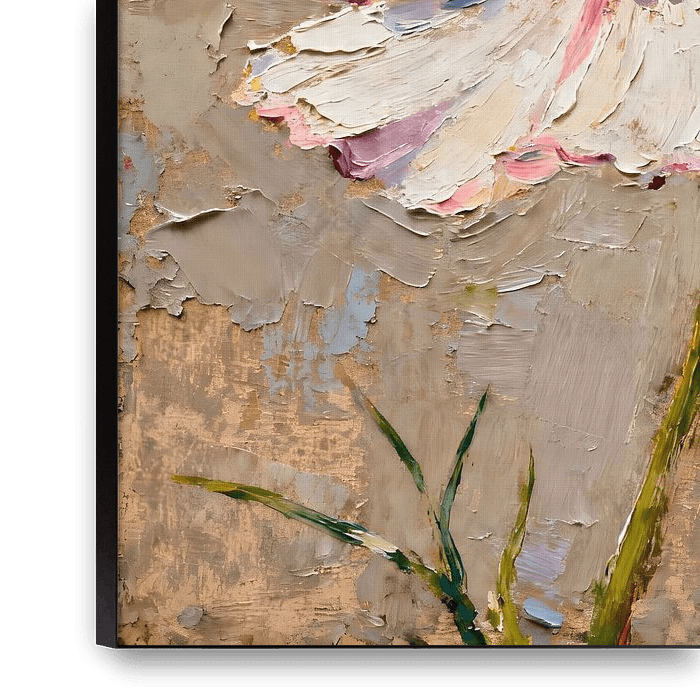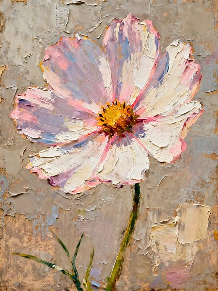 Eine großformatige Cosmea-Blüte dominiert dieses ausdrucksstarke Ölgemälde in klassischer Impasto-Technik. Die Blütenblätter in zartem Weiß, sanftem Rosa und kühlem Lavendelblau sind mit kräftigen Spachtelstrichen aufgetragen – die sichtbare Farbmasse verleiht dem Werk eine beeindruckende plastische Tiefe und haptische Qualität. Das…
