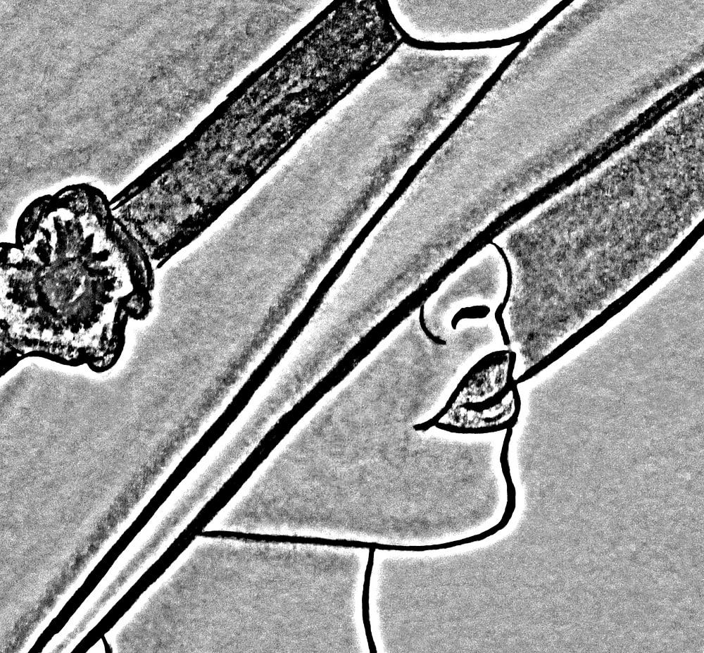 Ich habe eine Zeichnung von einer Dame mit einem großen Hut erstellt und digital bearbeitet.