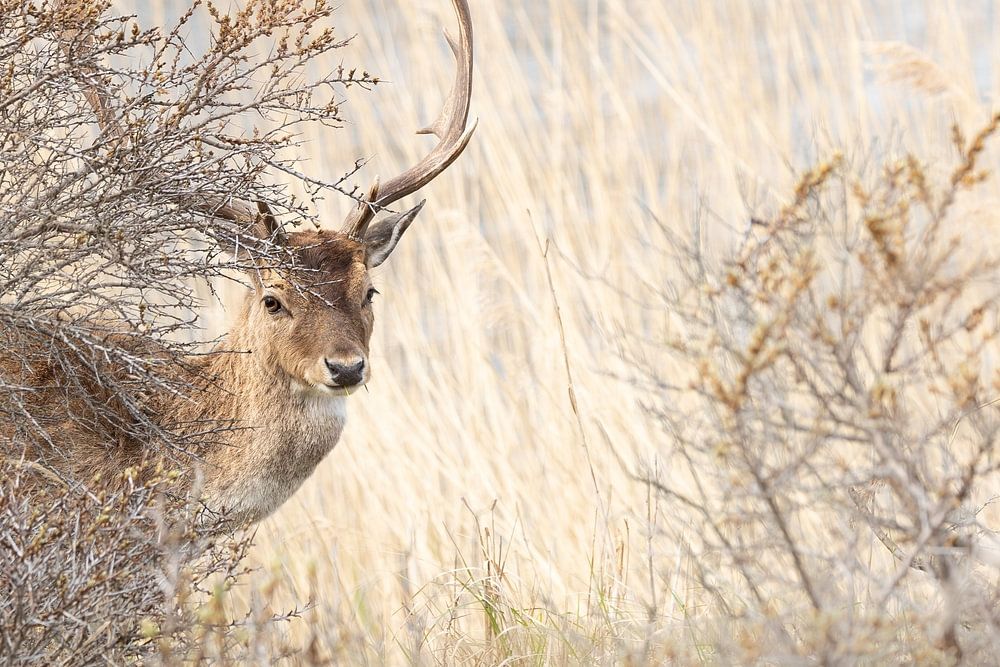 Ein Damhirsch mit schönem Geweih steht zwischen den kahlen Ästen der Büsche in den Dünen. Das Schilf hinter ihm weist auf das Wasser des Wassereinzugsgebiets für Amsterdam. Es ist ein schöner sonniger Tag, der für eine schöne helle, heitere und romantische Atmosphäre sorgt. Der Damhirsch ist auf der Durchreise zum nächsten Futterplatz, aber zum Glück für mich hält er an, so dass wir uns einen Moment lang beobachten können.