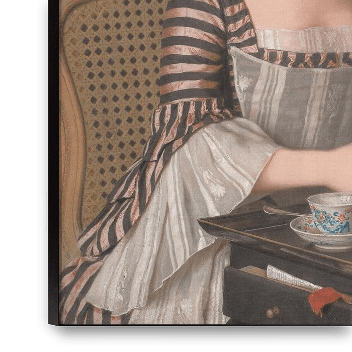 Beim Frühstück beobachtet eine elegant gekleidete Frau ein kleines Mädchen, das einen Keks in den Milchkaffee taucht. Das Mädchen trägt Lockenwickler aus Papier in ihrem Haar. Kaffee und Schokolade waren im achtzehnten Jahrhundert exklusive und kostspielige Getränke; das dazu verwendete Porzellan und Silberbesteck war nicht weniger luxuriös.