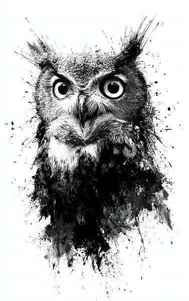 Die Eule starrt direkt nach vorne, vollkommen bewusst, vollkommen exponiert. Die verstreuten Tintenflecken suggerieren Gedanken, die auseinanderbrechen, bevor sie Bedeutung annehmen können.