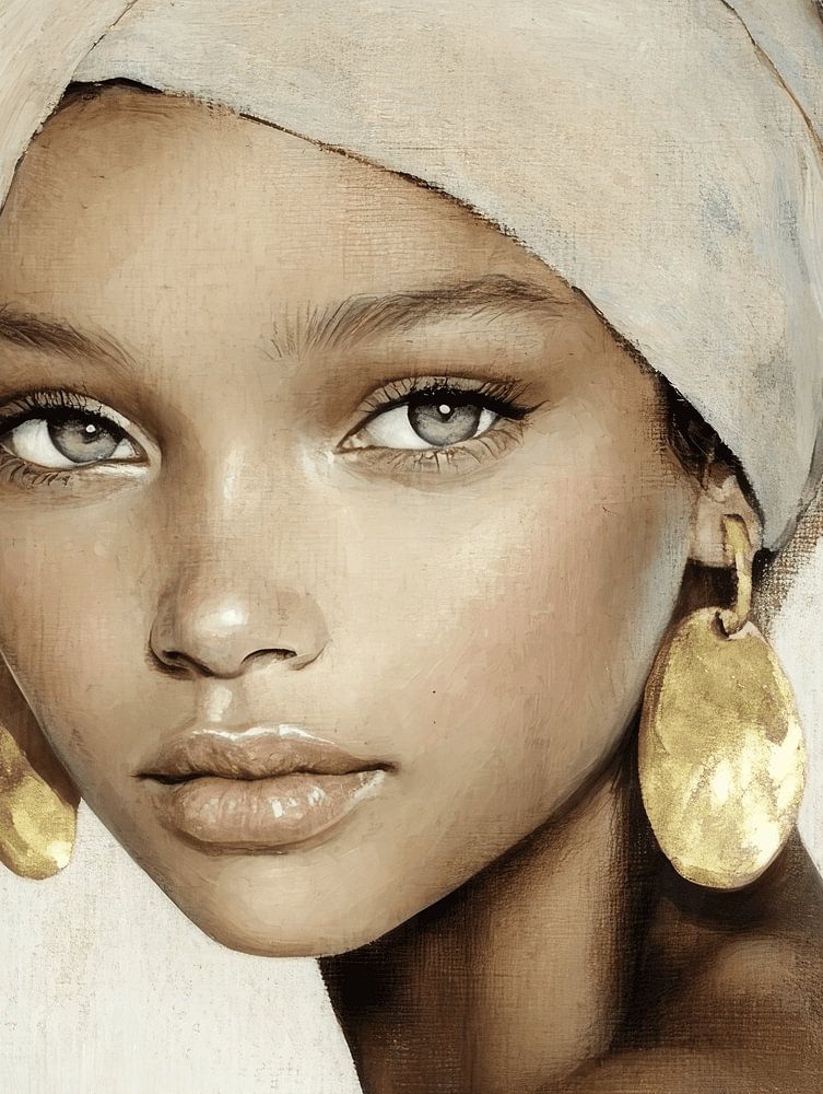 Das Mädchen mit den goldenen Ohrringen, mit einer Anspielung auf das Werk von Johannes Vermeer "Das Mädchen mit der Perle". In sanften Farbtönen ist dies ein besonderer Blickfang für Ihr Interieur.