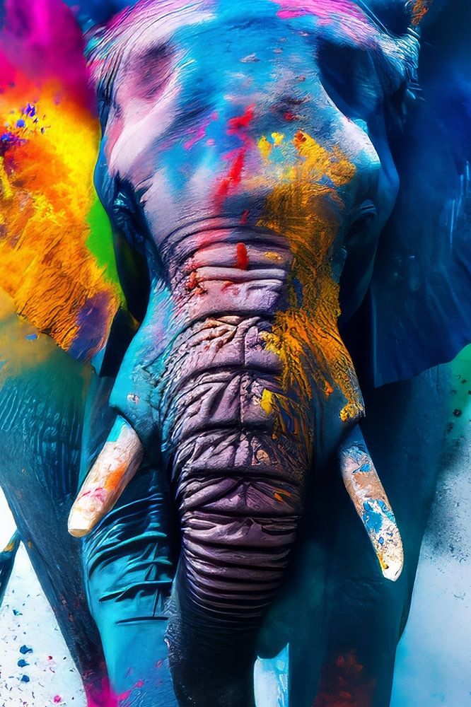 Diese künstlerische Darstellung eines Elefanten ist in ein Meer von Farben getaucht, die von kühlem Blau bis zu warmem Orange reichen und einen atemberaubenden Kontrast zu den natürlichen Grautönen des Elefanten bilden. Dieses kraftvolle Bild verwendet abstrakte Farbspritzer und dynamische Pinselstriche, um ein Gefühl von Bewegung und Emotion zu vermitteln und gleichzeitig die Majestät und ruhige Stärke des Tieres hervorzuheben. Eine perfekte Verschmelzung von Natur und Kunst, die inspiriert und Ehrfurcht einflößt.