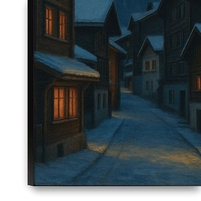 Dieses leuchtende Gemälde fängt das erste Licht des Morgens in Zermatt ein, wenn der schneebedeckte Gipfel des Matterhorns in einer goldenen Flamme des Sonnenaufgangs erstrahlt. Unten ruhen Reihen von Holzchalets ruhig im Schatten, ihre Fenster glühen sanft wie Glut gegen das frische Blau der frühen Morgendämmerung. Die Luft fühlt sich…