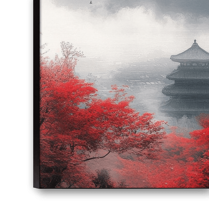 In rotes Ahornfeuer gehüllt, blickt die Pagode auf den Berg Fuji und flüstert der Morgensonne Gebete zu.