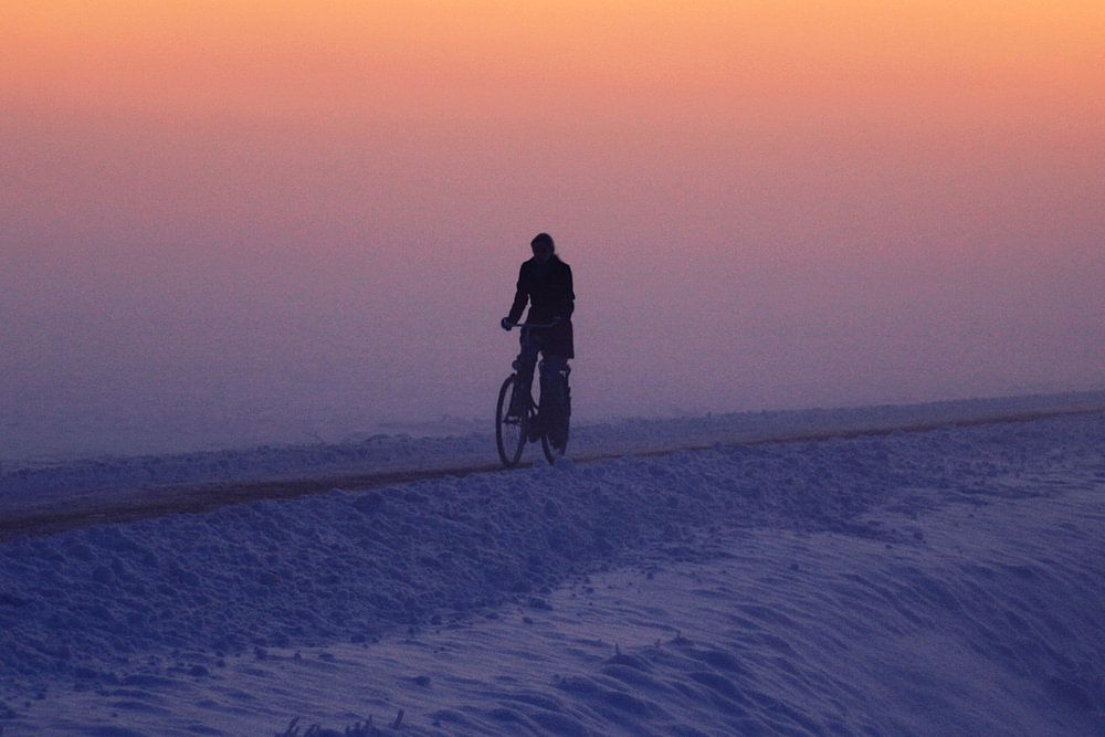 Een fietser op weg naar zijn werk op een prachtige winterse vroege ochtend.