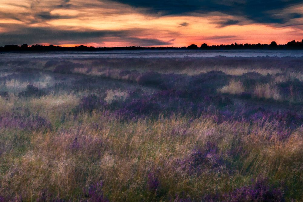 De kou wordt voelbaar. Een laag mist verschijnt als een deken over het heideveld. Een rijk pallet aan kleuren wordt zichtbaar.