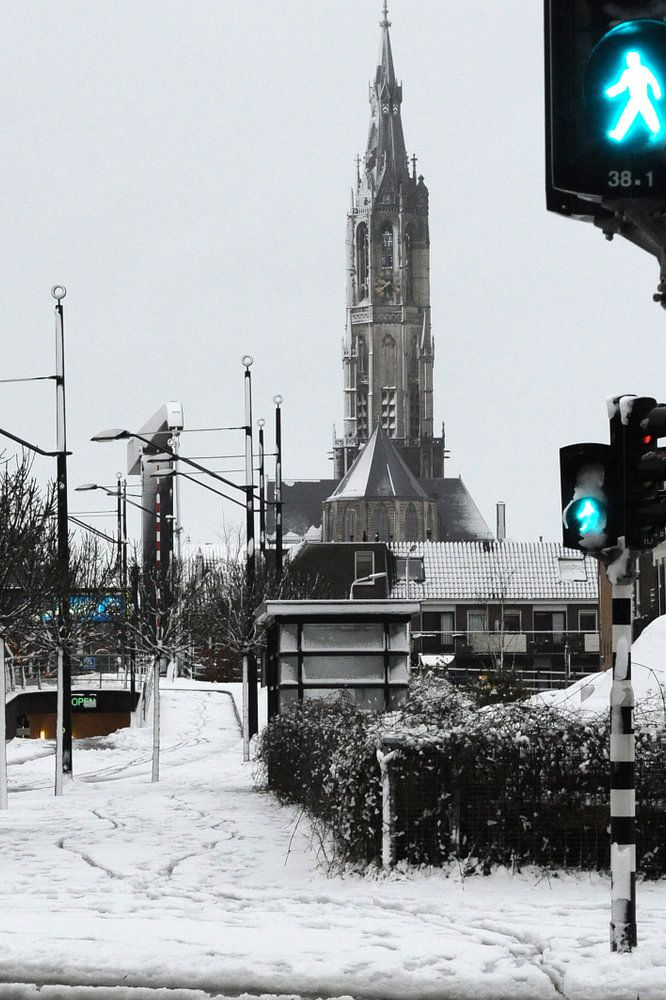 De Nieuwe Kerk in Delft gezien vanaf de Stalpaert vd Wieleweg in de sneeuw met verkeerlicht