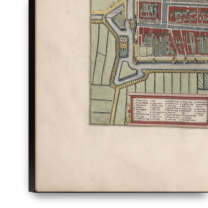 Karte, Index und Straßenkarte der Stadt mit ihren Verteidigungsanlagen, Gewässern, Plätzen und Märkten. Außerdem die Kirchen, Windmühlen und die Stadtmauer oder der Wall.