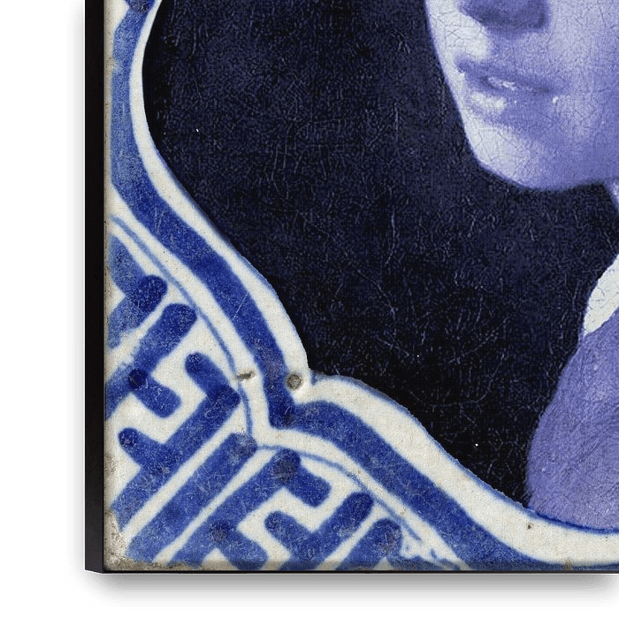Bestelle das digitale Kunst Bild Delfter Blau Fliese Mädchen mit Perlenohrring von Sander van Laar als Reproduktion auf Leinwand, Alu-Dibond, als Poster, Fototapete oder Acrylglasbild.