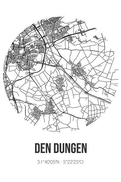 Schwarz-weiße Karte, Straßenkarte oder Straßenplan von Den Dungen. Den Dungen befindet sich in der Gemeinde Sint-Michielsgestel in der Provinz Noord-Brabant. Der Stadtplan enthält alle öffentlichen Straßen in Den Dungen. Außerdem enthält die Karte die Koordinaten des Zentrums von Den Dungen.