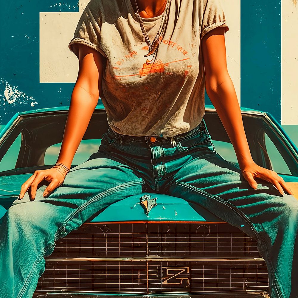 Ein Kunstwerk, das eine Frau in einem verblichenen T-Shirt und Jeans zeigt, die selbstbewusst auf der Motorhaube eines Oldtimers sitzt, der eine verwitterte gelb-blaue Lackierung hat. Sie trägt eine Flieger-Sonnenbrille und braune Stiefel und hat zerzaustes Haar. Im Hintergrund ist eine karge Landschaft zu sehen. Die Gesamtstimmung ist lässig und stilvoll und vermittelt ein Gefühl von Abenteuer und Freiheit.