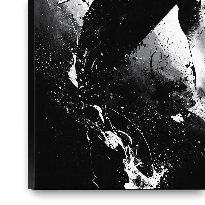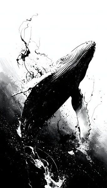Der Wal erhebt sich langsam aus einer undefinierten Dunkelheit, seine massive Gestalt ist sowohl kraftvoll als auch verletzlich. Die Tinte, die sich um seinen Körper auflöst, deutet auf eine Instabilität hin, die sich hinter seiner offensichtlichen Stärke verbirgt. Der minimalistische Hintergrund vermittelt ein Gefühl von unendlicher…