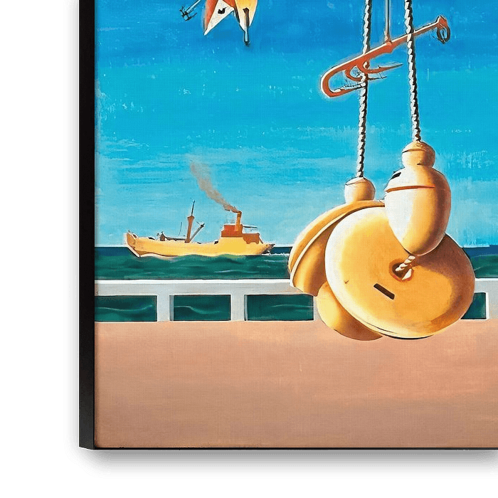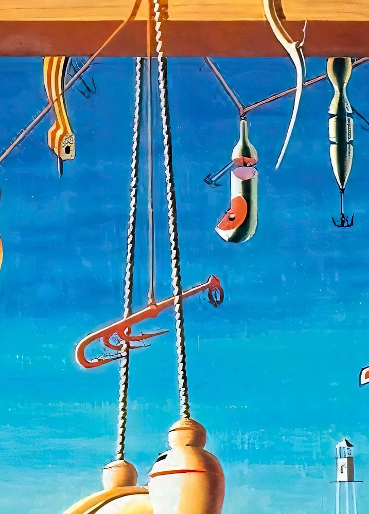 Die insgesamt surreale Atmosphäre erinnert an das Unterbewusstsein und die symbolischen Bilder, die man in den Werken von Künstlern wie Rene Magritte oder Yves Tanguy findet. Der Schauplatz am Meer und die Einbeziehung von Fischereiutensilien sorgen jedoch für ein subtiles maritimes Thema, das die fantastischen Elemente untermauert.