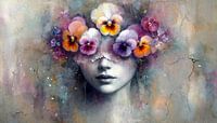 Dieses verträumte, ätherische Werk zeigt, wie der Frühling – verkörpert durch die junge Frau – erwacht. Während die bunten Veilchen bereits in voller Blüte stehen, lassen ihre blasse Haut und der Schleier vor ihren Augen erkennen, dass sie sich erst noch an das Sonnenlicht gewöhnen muss. Durch die Verwendung von Ölfarbe entsteht ein…