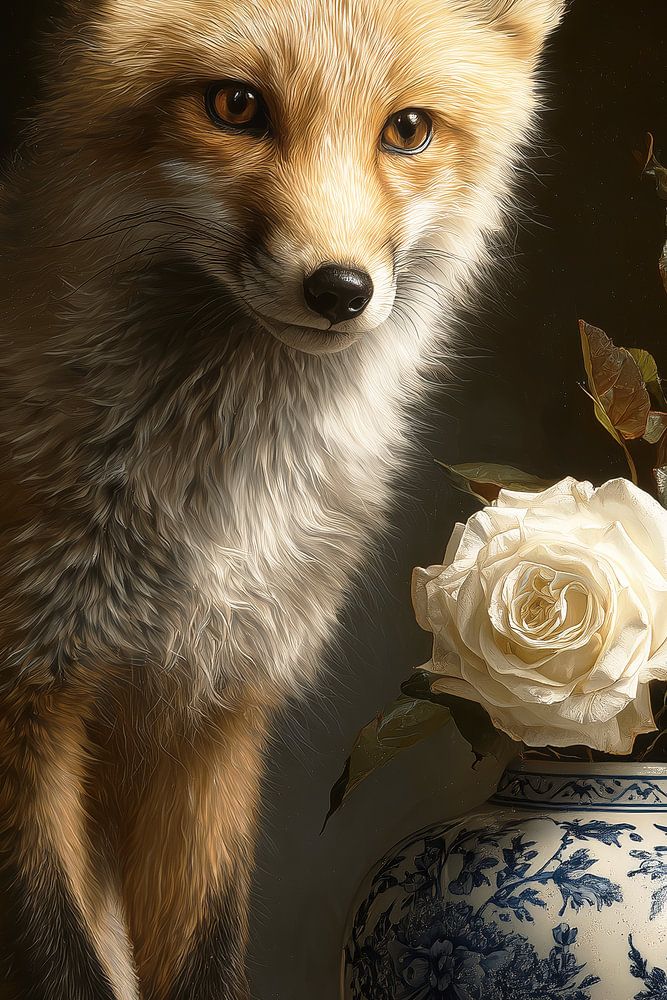 Ein neugieriger Fuchs posiert neben einer Vase mit weißen Rosen. Ein Stillleben, das dennoch lebendig ist - als ob der Fuchs jeden Moment mit einer Blume davonlaufen könnte.
