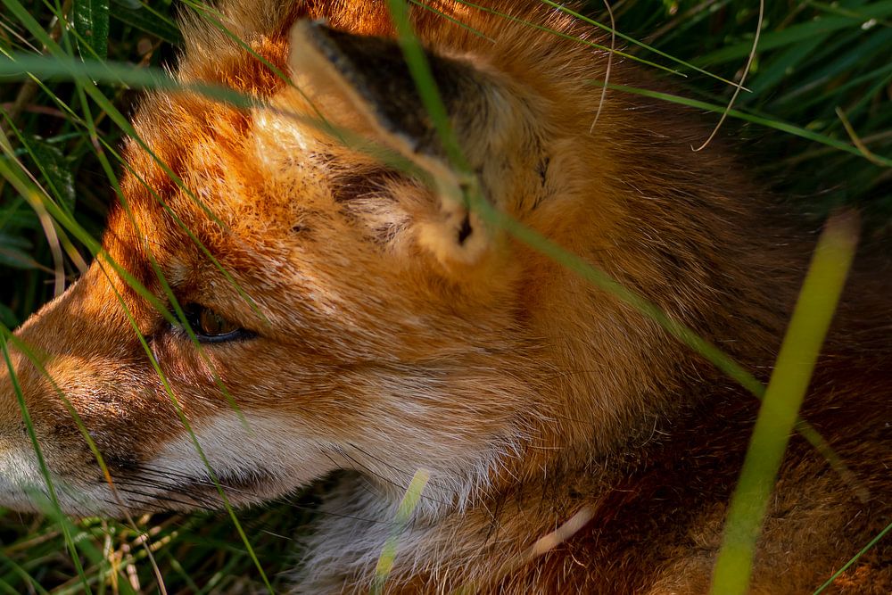 Dieses Foto wurde an einem relativ warmen Tag aufgenommen. Der Fuchs suchte Schutz vor der Sonne und legte sich gemütlich unter die Büsche im hohen Gras.