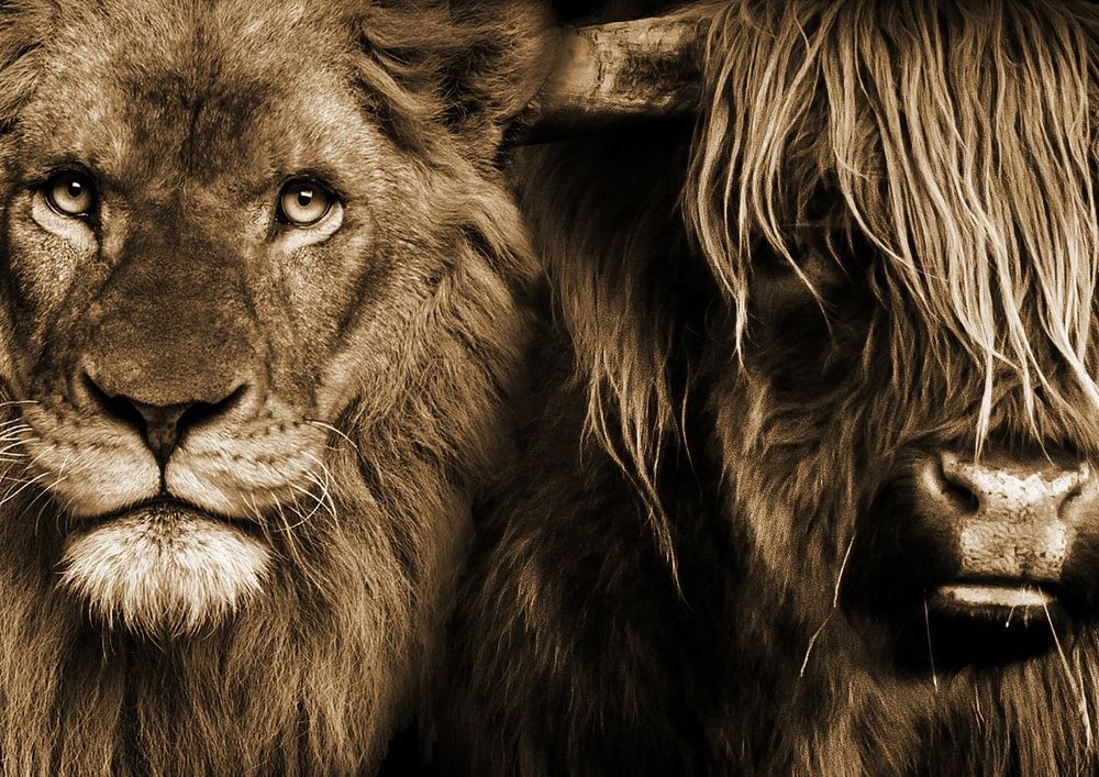 Der Löwe und der schottische Highlander. Ein schönes Werk in Sepiafarben von zwei kräftigen Jungen. Diese Arbeit ist von hoher Qualität und nirgendwo sonst erhältlich.