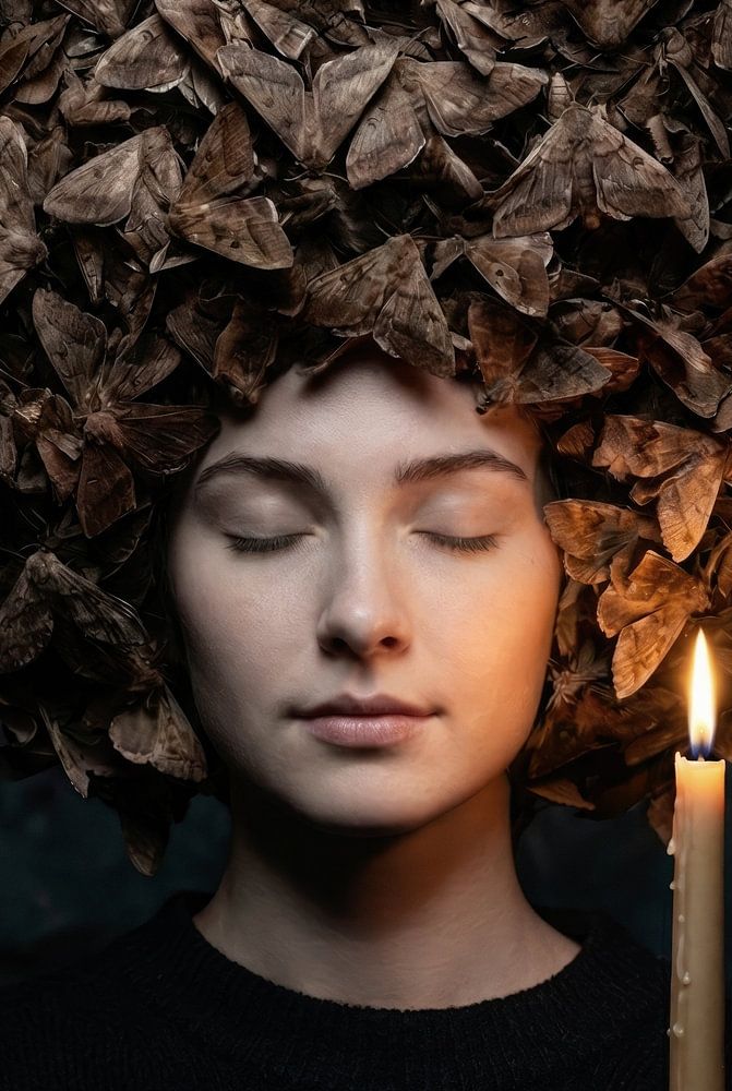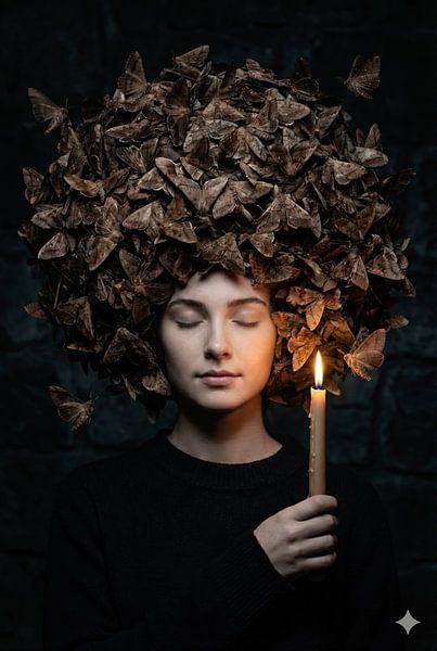 Dieses stimmungsvolle, surreale Porträt konzentriert sich auf die geheimnisvolle Anziehungskraft des Lichts. Das Haar der Figur verwandelt sich in einen beeindruckenden, lebendigen Schwarm aus Hunderten von samtig braunen Motten. Die Motten verklumpen zu einem voluminösen und strukturierten Ganzen, wobei die äußeren Exemplare sanft zu…