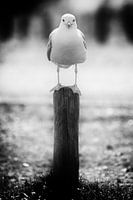 Digitale Schwarz-Weiß-Fotografie einer Möwe, die auf einem Pfahl steht.