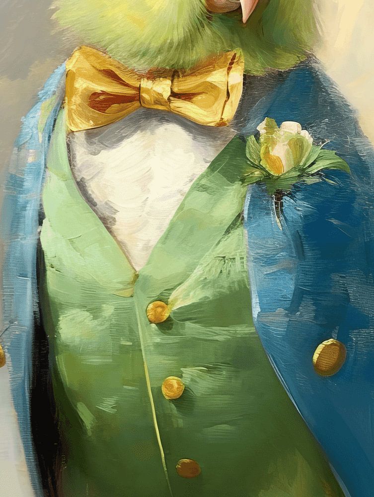Der Sittich, der sich für den König hielt. Buntes Porträt mit einem Augenzwinkern. Wählen Sie die Größe und das Material für dieses Werk und passen Sie es an Ihr Interieur an.