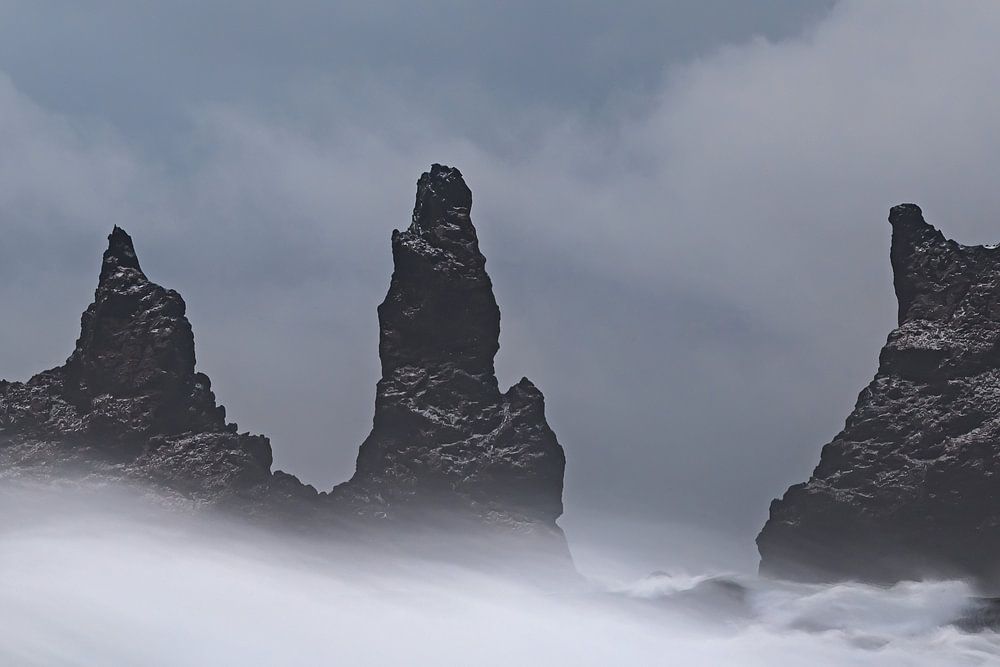 An der zerklüfteten Südküste Islands, wo die Brandung niemals ruht, ragen die mythischen Felssäulen von Reynisdrangar aus dem Meer. Vom abgelegenen Strand von Kirkjufjara aus fangen sie das erste und das letzte Licht des Tages ein, eingehüllt in Nebelschwaden aus spritzendem Schaum.