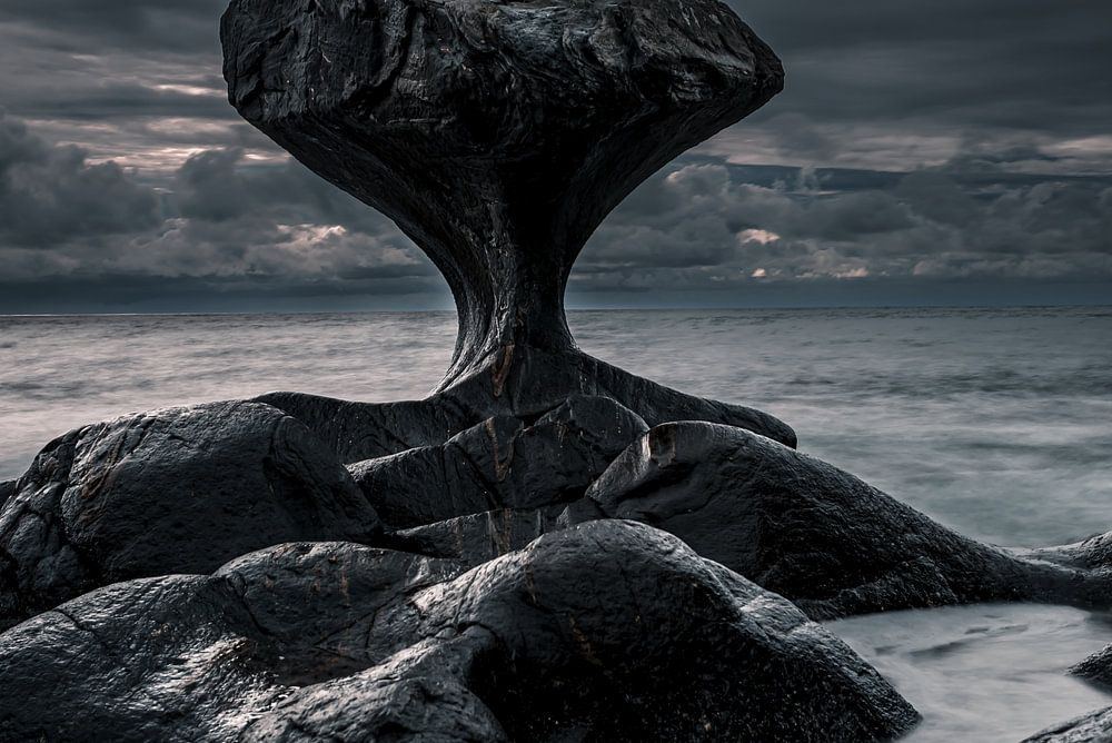 An einem bedeckten Tag, wenn das Licht diffus über die Umgebung fällt, scheint der Kannesteinen noch mehr mit der Landschaft zu verschmelzen. Himmel und Meer verschmelzen zu einer stillen, grauen Einheit, aus der sich der Felsen wie ein Anker der Einfachheit erhebt. Bei einer langen Belichtungszeit scheint sich das Meer in einen seidigen Nebel zu verwandeln. Darin schwebt der Kannesteinen, losgelöst von der Erde, fast so, als wolle er im Himmel verschwinden.