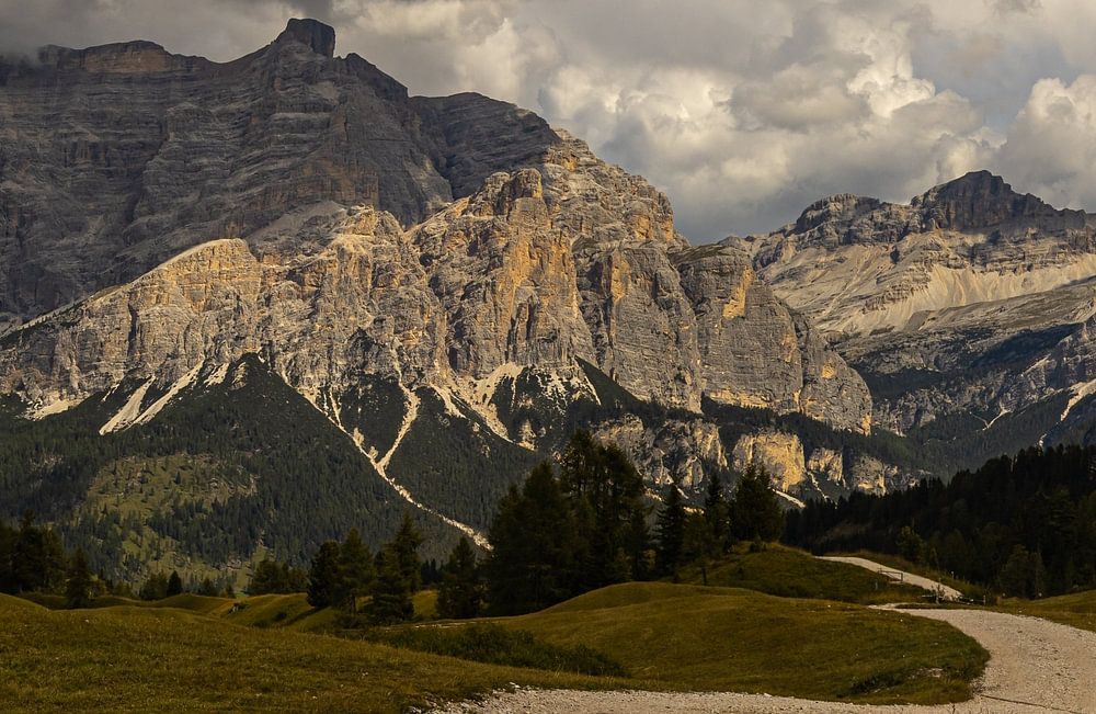 Eine schöne Aussicht auf die Berge des Piz dles Cunturines. Die Straße führt zu wunderschönen Aussichten auf die Dolomitenberge, die man immer wieder betrachten kann.