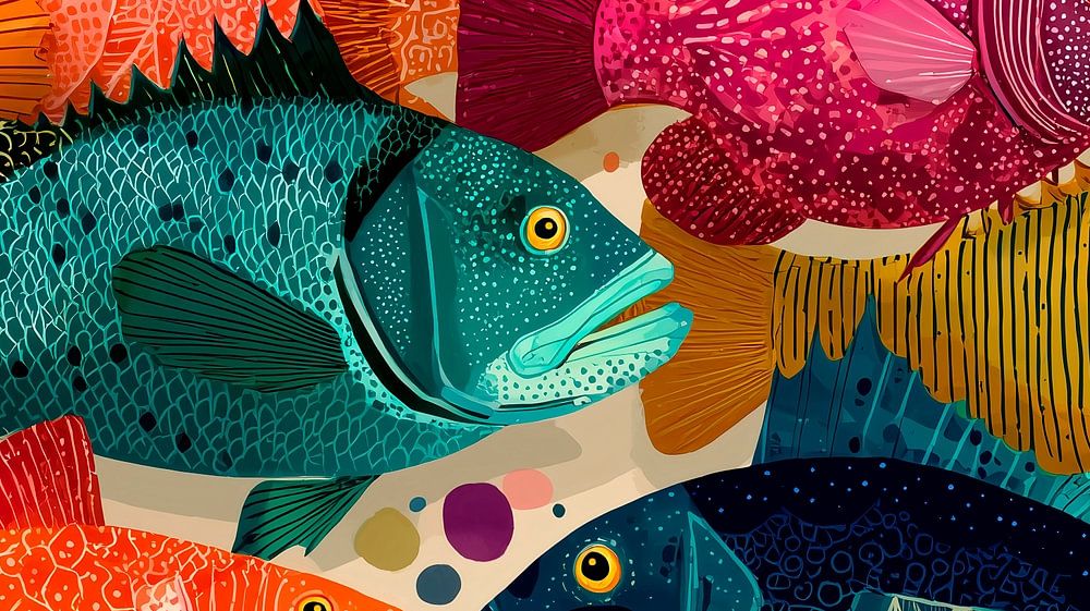 Ein lebhaftes Kunstwerk aus farbenfrohen Fischen, jeder mit komplizierten Mustern und Texturen. Die Fische sind in einer dynamischen Komposition angeordnet und zeigen eine Vielzahl von Farben. Sie stehen vor einem Hintergrund mit abstrakten, kreisförmigen Elementen, die über das gesamte Bild verstreut sind und zu einem lebendigen und verspielten Look beitragen.