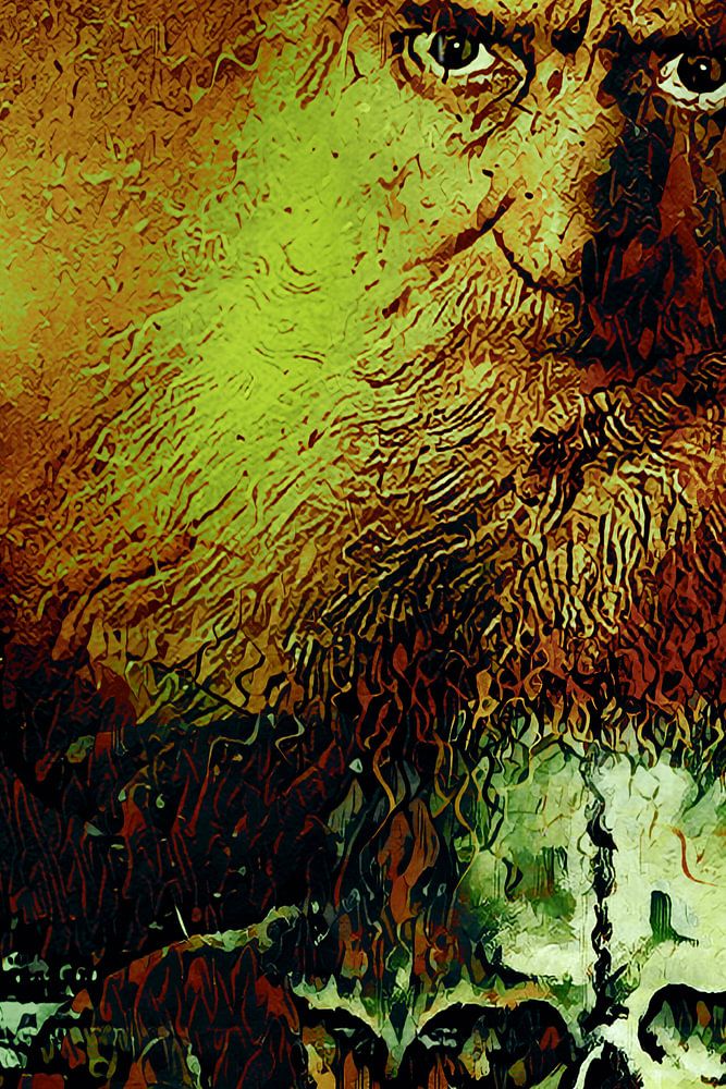 Der alte Mann schaut den Betrachter leicht irritiert an. Die Kerze brennt und wenn er nicht aufpasst, wird sein Bart komplett abbrennen, und das will der alte Mann wahrscheinlich nicht. Sein Bart selbst fächert sich über den oberen Schädel, der vor ihm steht, auf. Insgesamt sind es vier Schädel, wobei der vierte Schädel auf den drei darunter liegenden steht. Vielleicht war der alte Mann so wütend, dass er den Menschen etwas angetan hat. Ein vergangenes Trauma zum Beispiel, das er auf diese Weise zu bewältigen versucht. Das wird natürlich nicht funktionieren, im Gegenteil, das Trauma wird nur noch schlimmer und der alte Mann wird nur noch wütender und gefährlicher. Obwohl es sich natürlich um ein Halloween-Kunstwerk handelt, ist alles erfunden, eine erfundene Halloween-Geschichte, aber gruselig und lässt natürlich Raum für die eigene Fantasie. Die in diesem Kunstwerk verwendeten Farben sind rot, orange, gelb, grün und schwarz.