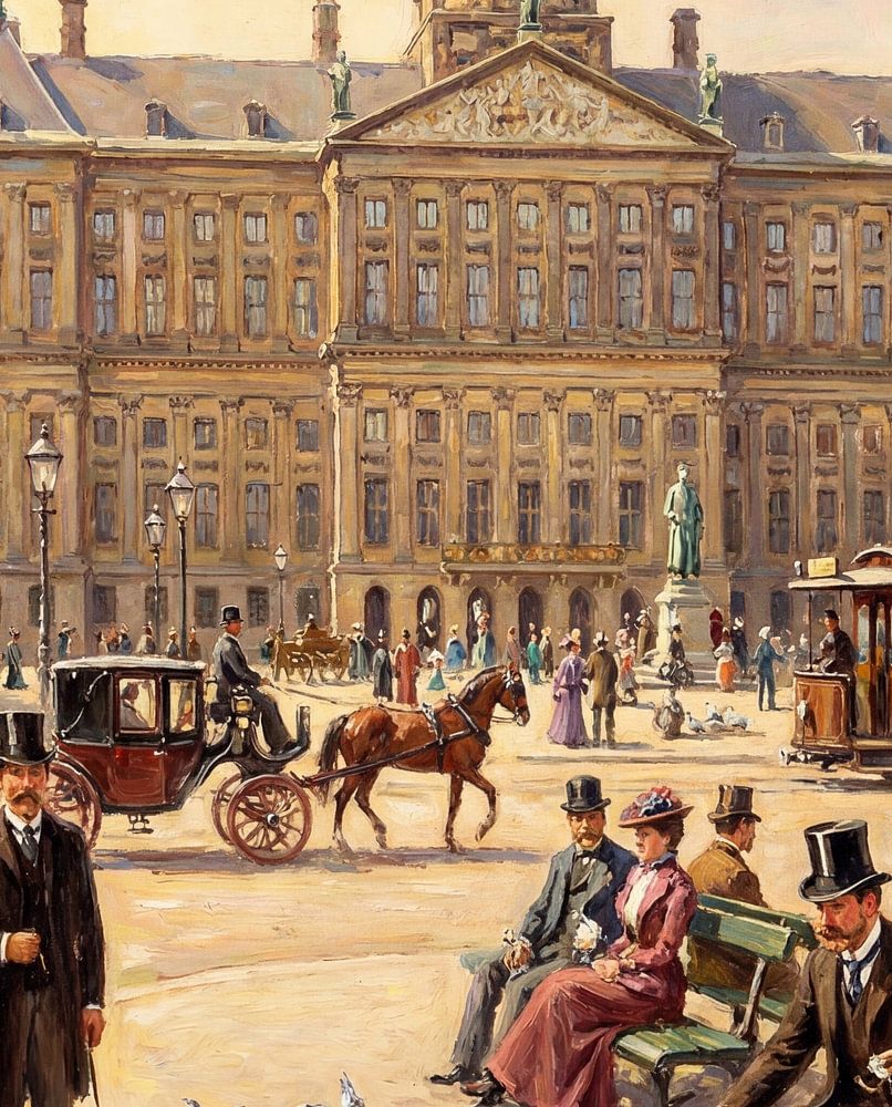 Der schöne Dam-Platz in Amsterdam, wie er um die Jahrhundertwende im Jahr 1900 ausgesehen haben könnte. Pferdegespanne, eine Dampfstraßenbahn und natürlich die Tauben auf dem Dam-Platz. Ein klassisches Bild des berühmtesten Platzes unserer Hauptstadt Amsterdam.