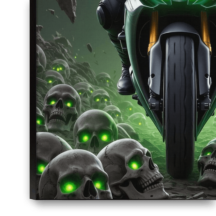 Eine düstere, übernatürliche Szene mit einer Kawasaki Ninja. Leuchtend grüne Scheinwerfer passen zu den unheimlichen Augen eines mit Totenköpfen übersäten Bodens. Es ist eine hochoktanige Mischung aus Tod und Geschwindigkeit, die in einer nebligen, filmreifen Atmosphäre eine „Green Reaper”-Stimmung verbreitet.