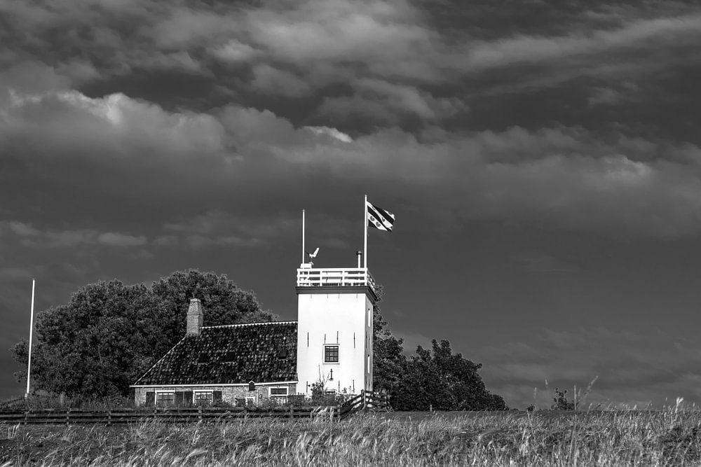 Der historische Leuchtturm von Workum auf dem IJsselmeerdeich zwischen Workum und Hindeloopen in Friesland in schwarz-weiß.