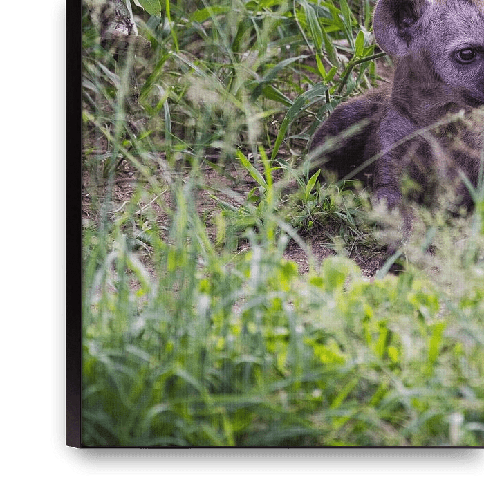 Inmitten des hohen Grases, gleich außerhalb des Schattens eines alten Baumes, liegt eine neugierige kleine Hyäne. Seine kleinen Augen funkeln vor Staunen, während er die Welt um sich herum beobachtet. Er ist noch jung, aber in seinem Herzen ist er bereits ein echter Entdecker.