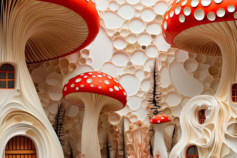 Erkunden Sie die märchenhafte Seite der Pilzwelt. Ein surreales Bild, das Pilze in einer völlig neuen faszinierenden Dimension zeigt, eine magische Welt voller Farben, Fantasie und skurriler Pilzkreaturen. Das Bild ist mit Unterstützung künstlicher Intelligenz entstanden und wurde mit Bildbearbeitungsprogrammen optimiert.