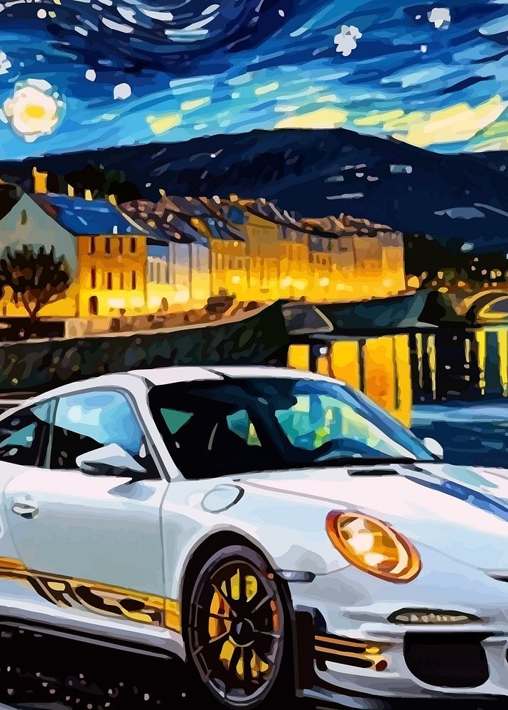 Der weiße Porsche 911 GT3 RS ruht unter Van Goghs Sternennacht wie eine leere Leinwand, die vom Mondfeuer berührt wird. Die Sterne über ihm schimmern und tanzen, ihr Licht umhüllt die Karosserie in sanfter Bewegung. In jeder Kurve spiegelt sich das kosmische Chaos, und in diesem stillen Moment wird das Auto zu mehr als nur einer Maschine - es wird zu einem Zeichen der Stille unter einem mit Träumen gemalten Himmel.