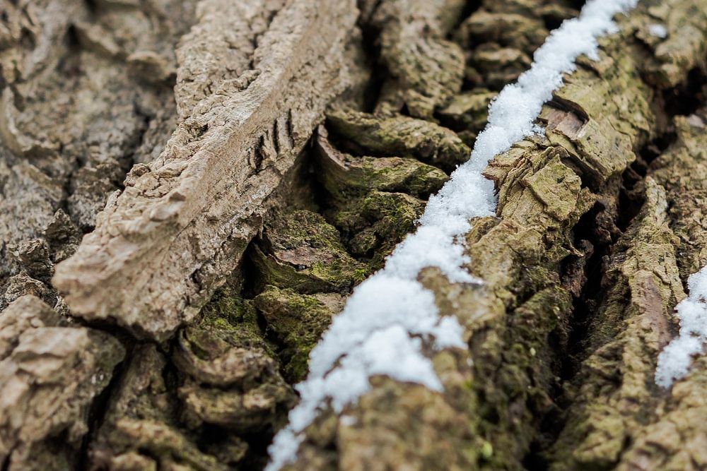 Detail von Wetterseiten auf Rinde von altem Baum im Winter mit Schnee und Moos