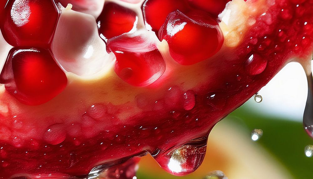 Detaillierte Nahaufnahme einer frischen Granatapfel mit Tropfen