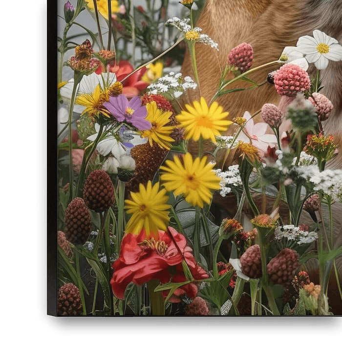 Fotorealistisches Porträt eines Boxers zwischen bunten Wiesenblumen.