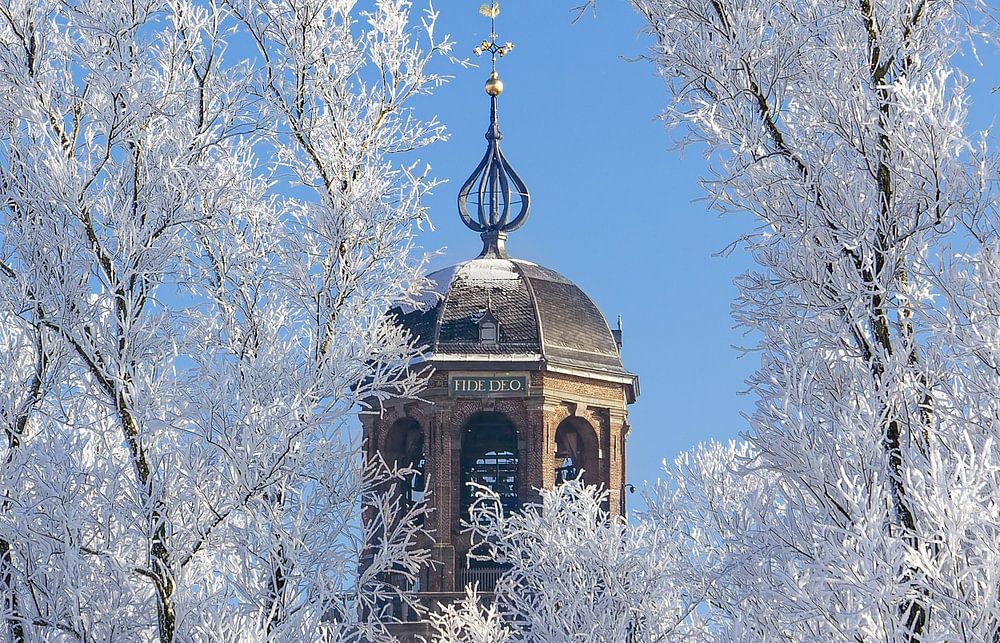 Ein Foto einer holländischen Winterlandschaft, wie wir sie selten sehen, mit Eis auf den Ästen der Bäume. Auf dem Foto sehen wir auch den Turm der Lebuinus-Kirche in Deventer, Overijssel.