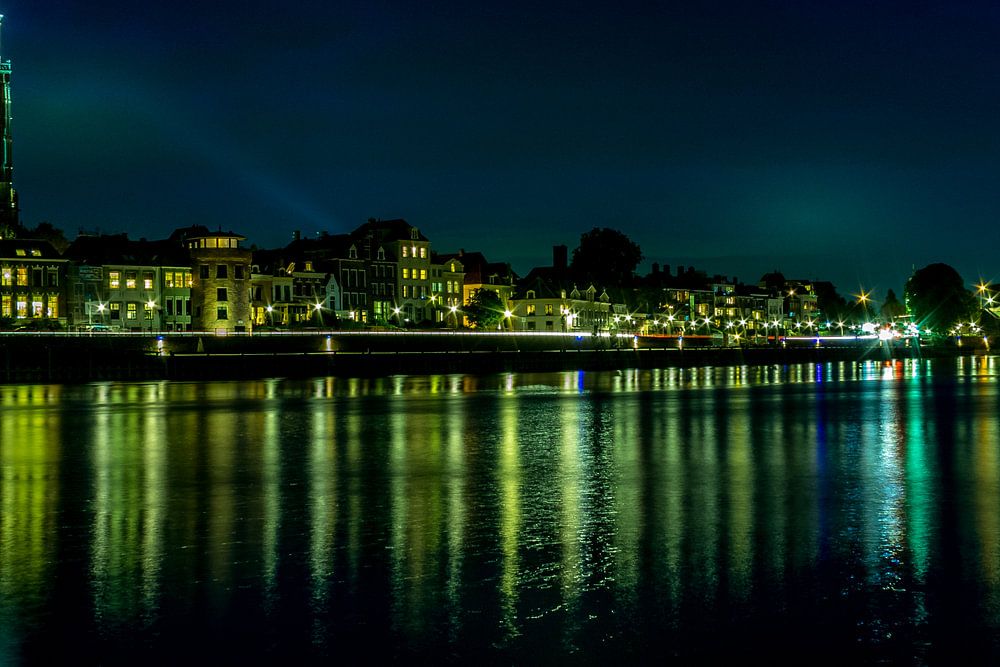 Wunderschön ausgeleuchtete Deventer-Skyline entlang des Eisflusses. Mit einer schönen Spiegelung im Wasser.