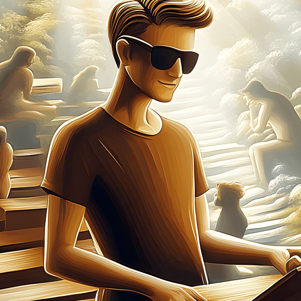 Tauchen Sie ein in eine surreale Welt, in der Kreativität auf Ruhe trifft. Die Architekten des Lichts zeigen einen Visionär mit Sonnenbrille, der auf einer hölzernen Oberfläche inmitten einer Versammlung nachdenklicher Gestalten akribisch arbeitet. Die goldenen Strahlen der Sonne dringen durch das üppige Blätterdach und erhellen den ruhigen Arbeitsbereich, in dem Kunst und Gedanken verschmelzen.