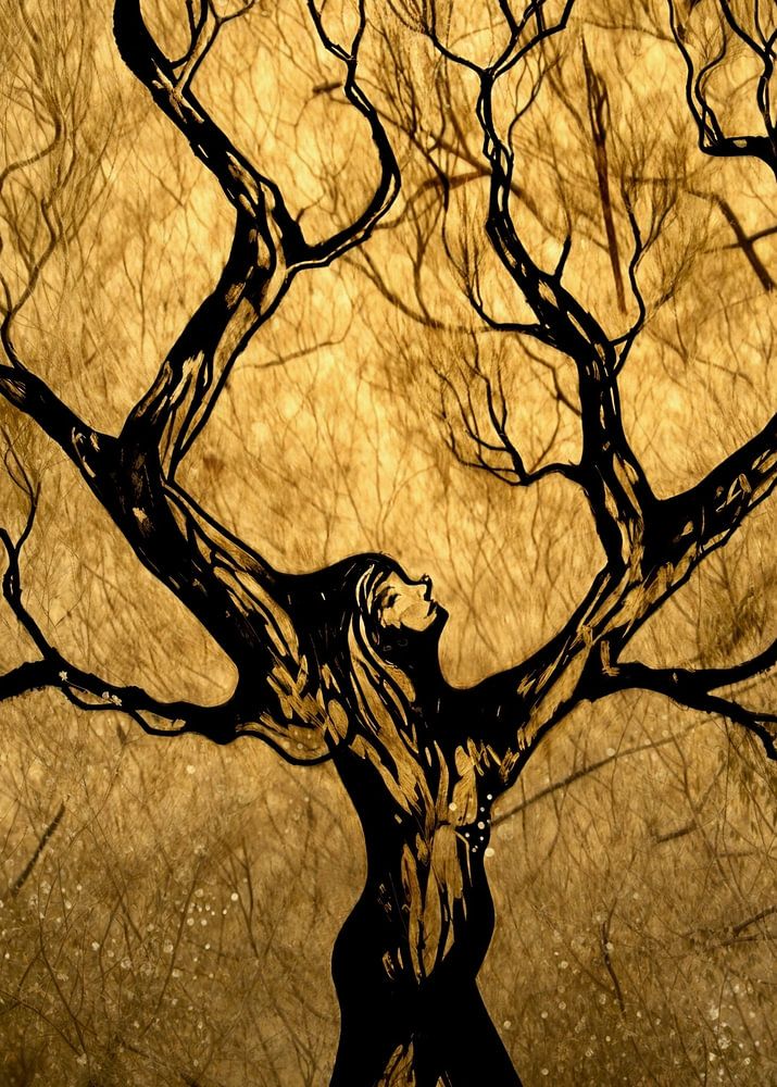 Als Kind kannte ich diesen Mythos nicht. Aber trotzdem habe ich sehr oft Bäume gezeichnet. Und diese Bäume wurden sehr oft zu Frauen. Als Teenager fiel mir ein Buch mit Holzschnitten von Gustave Doré in die Hände. Darin befanden sich wunderschöne Tafeln, auf denen es von Baummenschen wimmelte. Ich habe mich von ihnen inspirieren lassen und schaue mir heute noch Bäume an und sehe Arme und Finger in den verschlungenen Ästen. Wenn ich irgendetwas zeichne, ist es oft ein Baum. Und manchmal hat dieser Baum ein sehr menschliches Aussehen... Dies ist eine Federzeichnung, die ich digital fotografiert und bearbeitet habe.