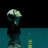 Futuristisches digitales Kunstporträt einer Wasserballsportlerin, die nachts in ein dunkles Schwimmbecken eintaucht, die Augen geschlossen hat und einen gelassenen Ausdruck vor einem tiefgrünen Hintergrund zeigt.