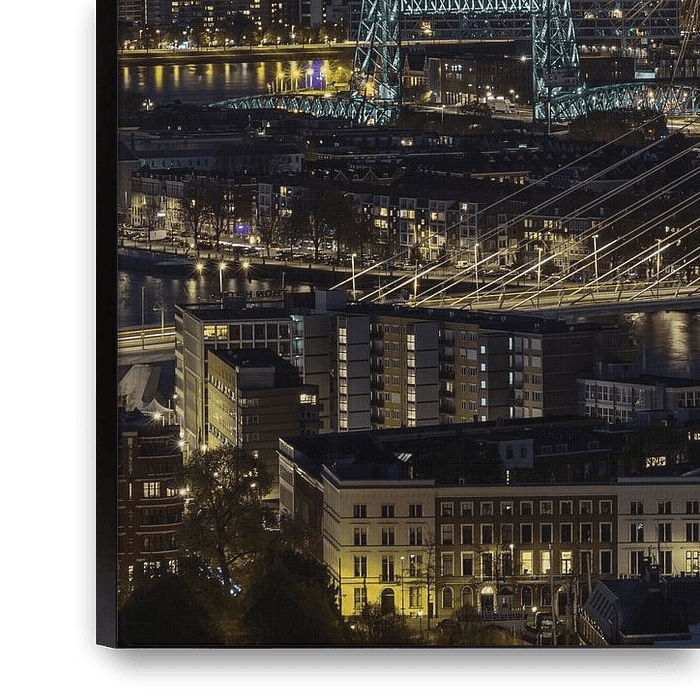 Bestelle dieses Rotterdam-Wandbild Die Erasmusbrücke in Rotterdam in der Farbe Gold mit einem Feuerwerk anlässlich des 10-jährigen Best von MS Fotografie | Marc van der Stelt als Reproduktion auf Leinwand, Alu-Dibond, als Poster, Fototapete oder Acrylglasbild.