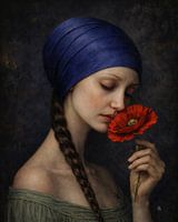 Du berührst eine rote Mohnblume, als wäre sie eine Erinnerung. Dein Zopf fällt langsam herab, und mit ihm die Zeit. In der Stille deiner geschlossenen Augen lebt das, was nicht zurückkehren wird.
