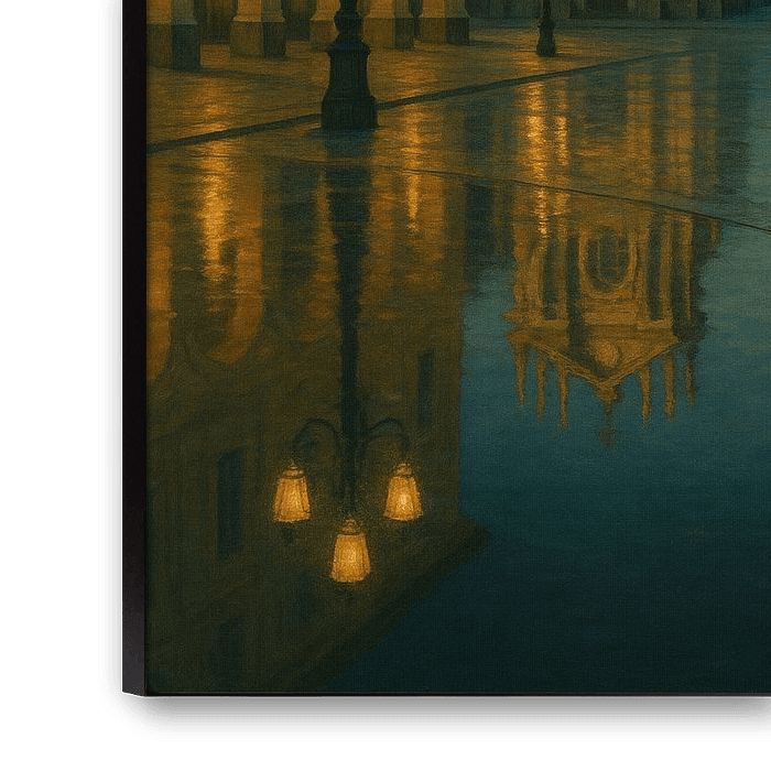 Die Szene spricht im Flüsterton - ruhige Straßen, leuchtende Spiegelungen, durch Wärme gemilderte Symmetrie. Das Gemälde verbindet die Zurückhaltung des Nordens mit dem Licht des Südens und schafft so ein seltenes Gleichgewicht von Anmut und Emotion.